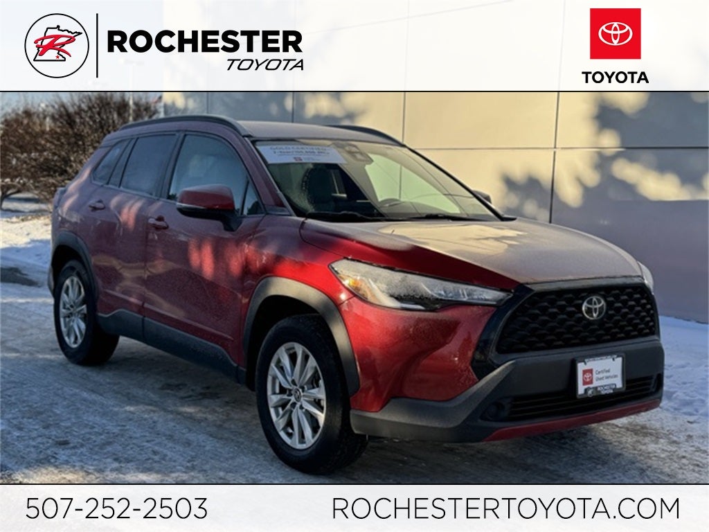 Discover confidence, efficiency, and everyday versatility in this Certified 2022 Toyota Corolla Cross LE AWD, a Clean CARFAX compact SUV finished in eye-catching Barcelona Red Metallic and engineered to handle all seasons with sure-footed all-wheel drive and an impressive 29/32 city/highway MPG rating. This Corolla Cross LE AWD is well equipped with advanced safety and driver-assist technologies including Collision Warning System, Adaptive Cruise Control, Blind-Spot Monitors, Lane Keeping Assist, Automatic High-Beam Headlights, and Toyota Safety Connect with a 1-year trial, giving you peace of mind on every drive. Inside, you'll enjoy a modern cabin featuring touchscreen controls, backup camera, Apple CarPlay, Android Auto, Bluetooth® hands-free connectivity, SiriusXM, portable audio connection, automatic climate control, fabric seat trim, power windows and locks, remote keyless entry, and steering wheel-mounted audio controls for added convenience. Riding on stylish 17-inch alloy wheels and supported by 4-wheel disc brakes, ABS, traction control, and electronic stability control, this Certified Corolla Cross LE AWD delivers a balanced blend of comfort, capability, and reliability - making it an excellent choice for drivers seeking a versatile and well-equipped all-wheel-drive SUV.